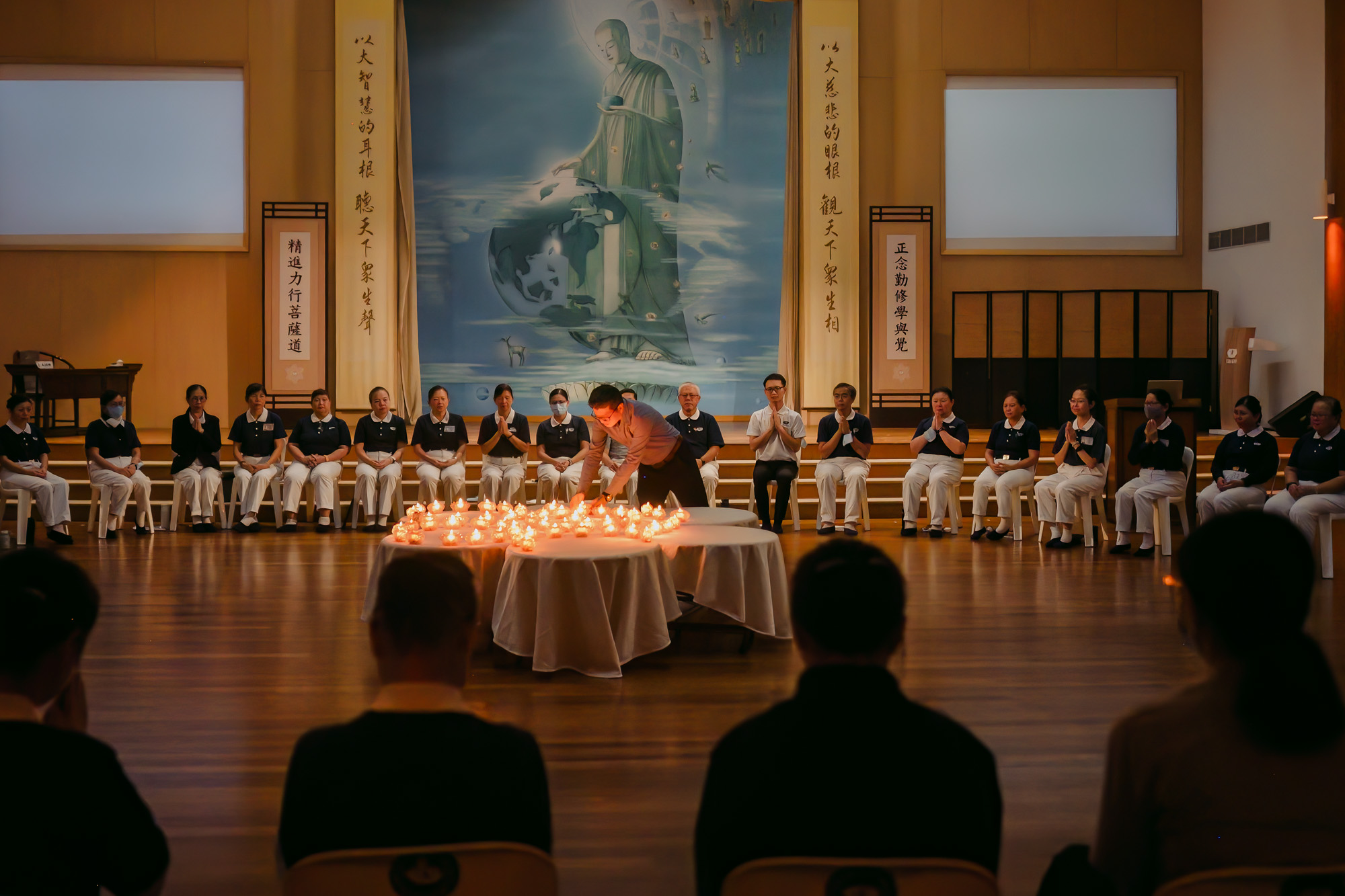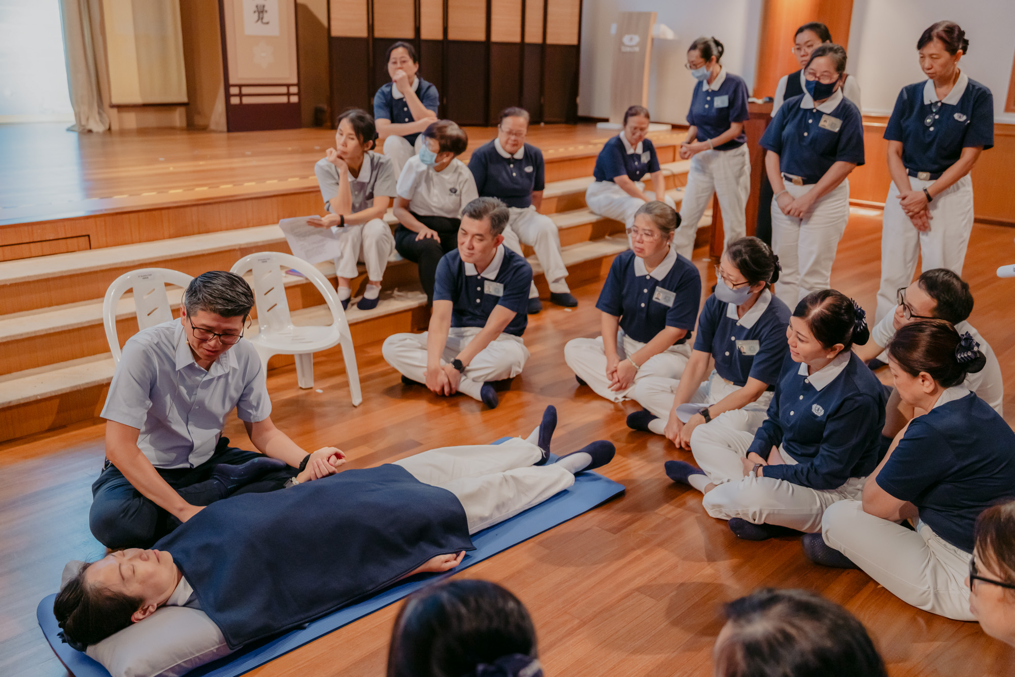 On August 9 and 10, 2025, about forty participants, including Tzu Chi home visit staff, dialysis centre staff, home care teams, and community volunteer Dharma family care team, gathered at Jing Si Hall to learn how to accompany care recipients and patients while also attending to their own emotions, fostering care for both themselves and others.