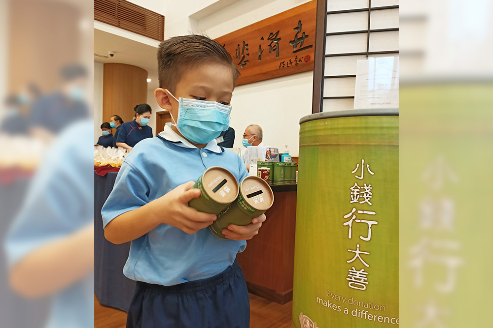 “叮叮咚咚!”每逢慈济大型活动,都缺不了热闹的“回归竹筒岁月区”。沈佳烨小弟弟努力踮起脚尖,将存在竹筒很久的铜板,一一倒入功德海里。就读慈济大爱幼教中心的沈佳烨,